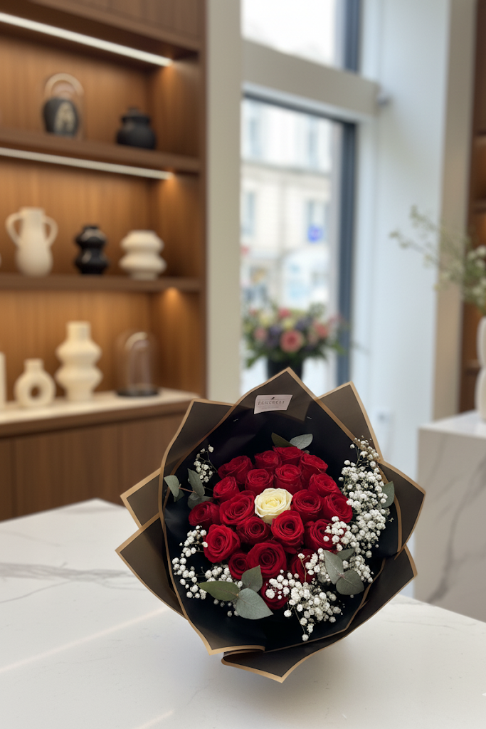Unter frischen Rosen, welche eine Länge von 60 cm aufweisen, präsentiert sich ein perfektes Geschenk für jeglichen Anlass. Die edle Seidenverpackung gewährleistet nicht nur eine ansprechende Ästhetik, sondern zeichnet sich auch durch ihre Reißfestigkeit bei Feuchtigkeit aus. Zusätzlich sind die Rosen mit frischem Schleierkraut und Eukalyptus versehen,