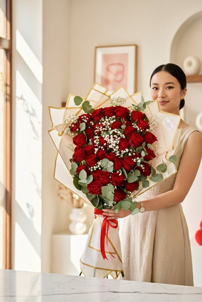 40 Rosen Edel verpackt Eukalyptus Schleierkraut