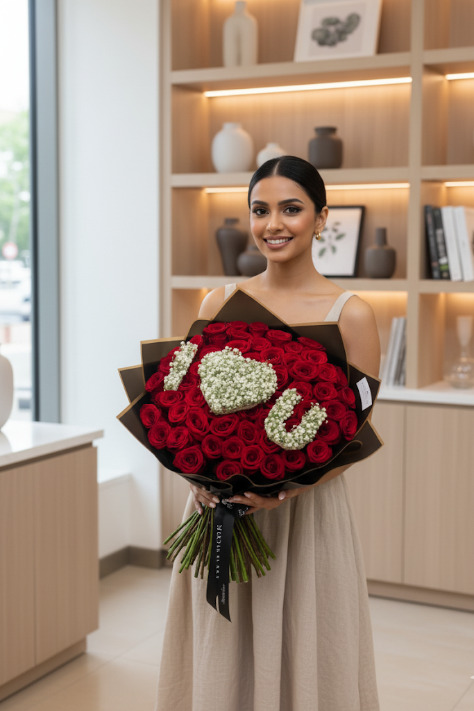 Unter 50 frischen Rosen mit Schleierkraut I Love U Schrift, welche eine Länge von 60 cm aufweisen, präsentiert sich ein perfektes Geschenk für jeglichen Anlass. Die edle Seidenverpackung gewährleistet nicht nur eine ansprechende Ästhetik, sondern zeichnet sich auch durch ihre Reißfestigkeit bei Feuchtigkeit aus.